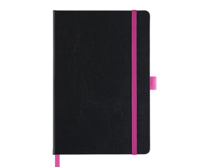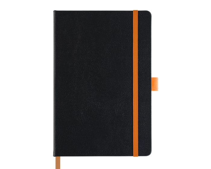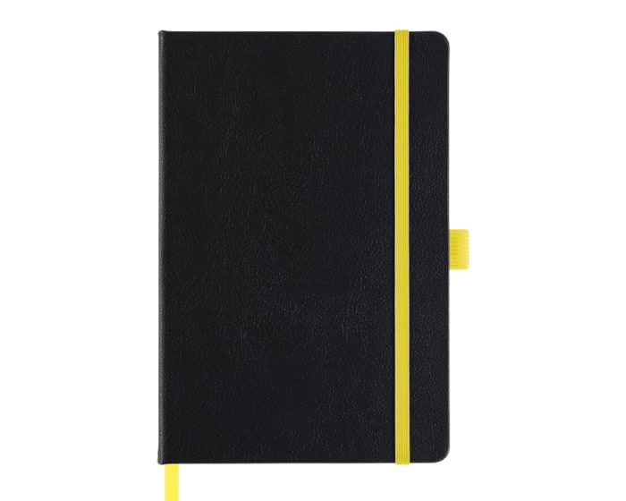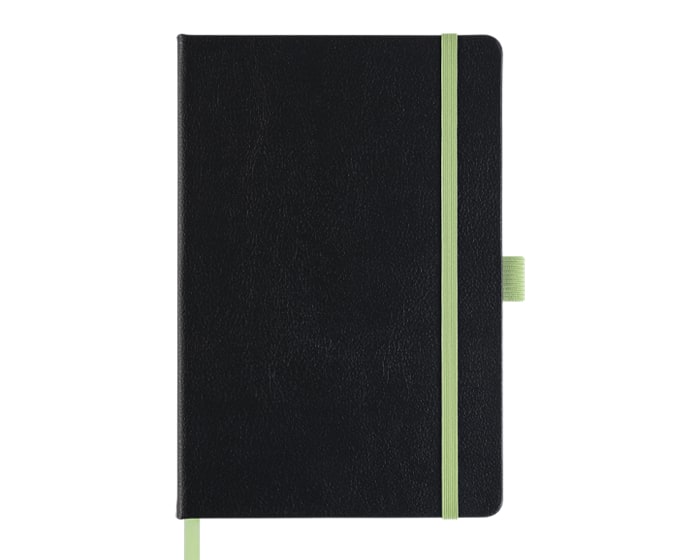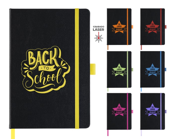 Libreta personal tamaño A5 con 80 hojas rayadas (160 páginas). Cuenta con listón separador, banda elástica para sujetar la cubierta y resorte para el bolígrafo (no incluido). Al grabar en láser se revela el color similar al resorte de la libreta.
