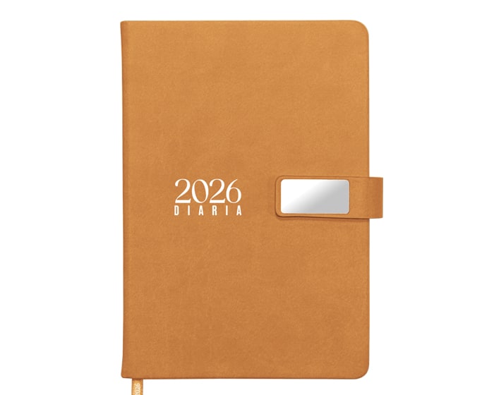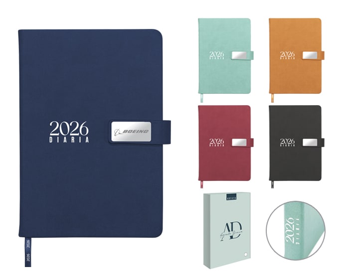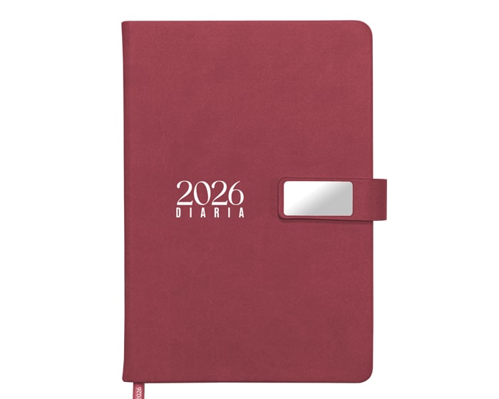 Agenda diaria de pasta rígida con cintillo magnético de PU con placa metálica y logotipo en color plata. Cuenta con 170 hojas (340 páginas), Incluye: cuadro de dedicatoria, hoja de datos personales, calendario 2026 y días festivos, calendarios 2025 a 2029, planificador anual, planificadores mensuales (12), agenda diaria 365 días, directorio de contactos y teléfonos de interés. Cuenta con resorte sujetador para bolígrafo y listón separador de color, impreso con el año 2026. Presentación: caja de regalo a color.