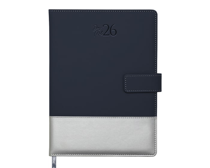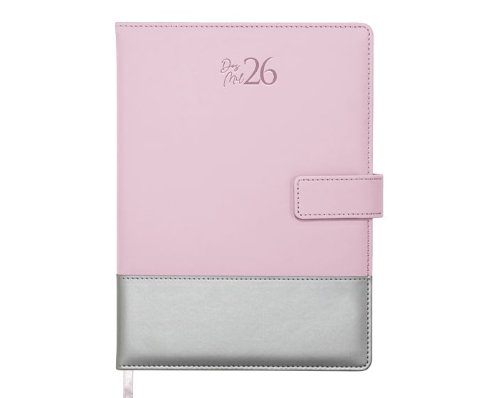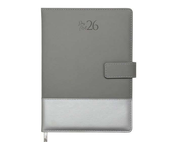Agenda semanal de pasta rígida bicolor, de PU con cintillo magnético para cerrar y resorte para bolígrafo. Cuenta con 98 hojas (196 páginas), contenido: cuadro de dedicatoria, hoja de datos personales, calendario 2026 y días festivos, calendarios 2025 a 2029, planificador anual de gastos, planificador de proyectos (5), planificador anual, planificadores mensuales (12), agenda semanal, directorio de contactos, teléfonos de interés, hojas para notas, Mapa Red Metro CDMX, Mapa Red Metrobús CDMX, Mapa Macrobús Guadalajara, Jalisco; Mapa Transmetro Monterrey, Nvo. León, Hoja de Stickers. Incluye: Listón separador de color, impreso con el año 2026. Presentación: caja de regalo a color.