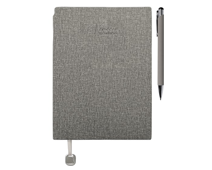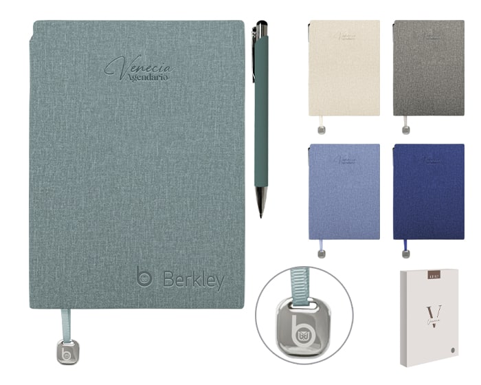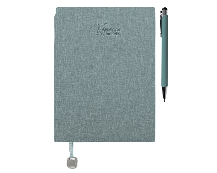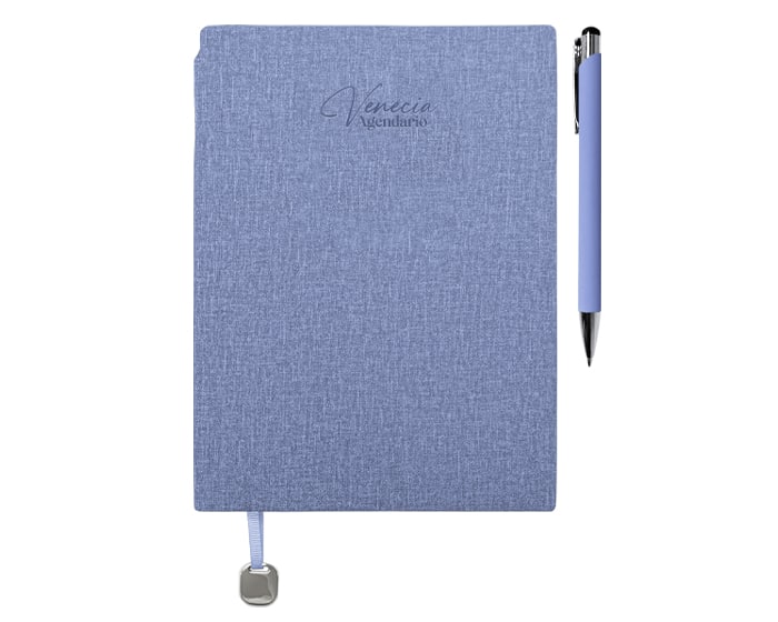 Agendario de pasta flexible texturizada de 112 hojas (224 páginas), contiene: cuadro de dedicatoria, hoja de datos, calendarios de 2026 a 2029, planificador anual (4); planificador de gastos (4); planificador de proyectos (5), agendario, hoja para notas punteada y listón separador con placa metálica. Incluye: Bolígrafo de aluminio del color de la libreta con mecanismo de click. El bolígrafo se puede insertar en el lomo de la libreta para transportarlo de forma segura. Presentación: caja de regalo a color.