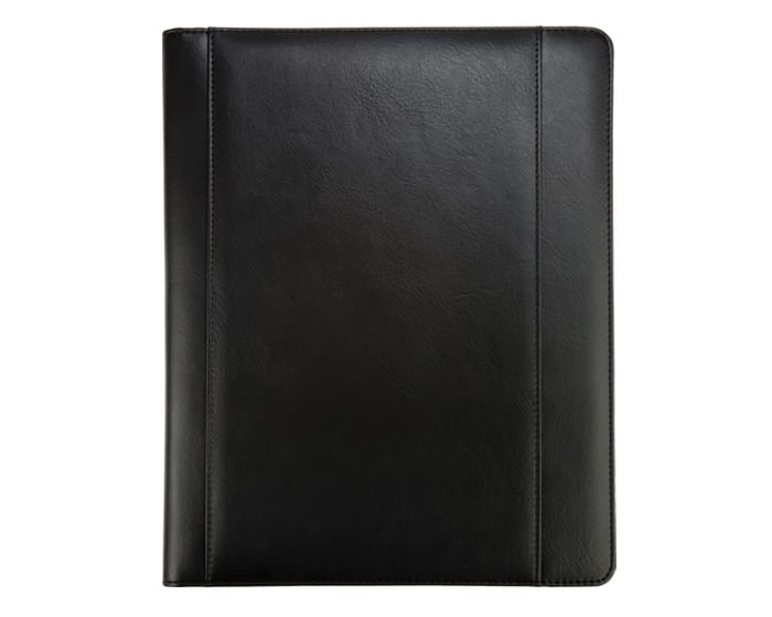 Carpeta ejecutiva con block de 29 hojas rayadas, banderas adhesivas, compartimento para documentos, porta tarjetas y cinta elástica para sujetar pluma.
