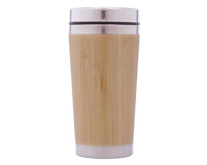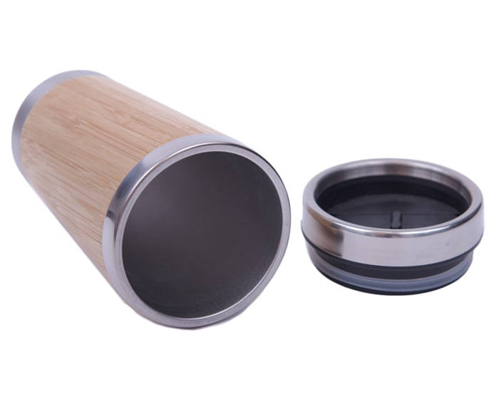 Termo de doble pared de acero inoxidable con exterior de bambú. Tapa a presión con seguro deslizable. CAP. 445 ml. Presentación: Caja en color blanco.