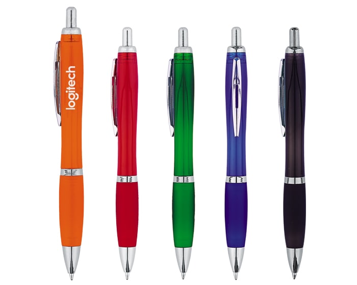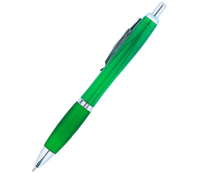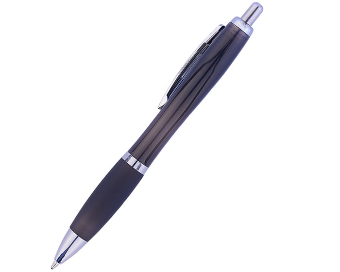 Bolígrafo de plástico con cuerpo traslúcido, clip metálico y goma antideslizante. Mecanismo de click. Artículo Promocional