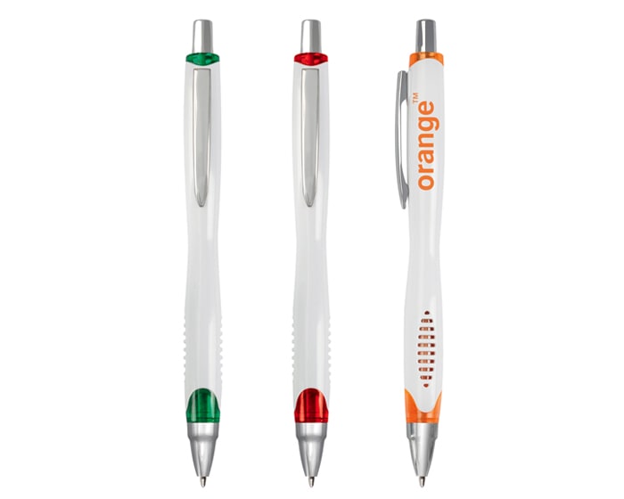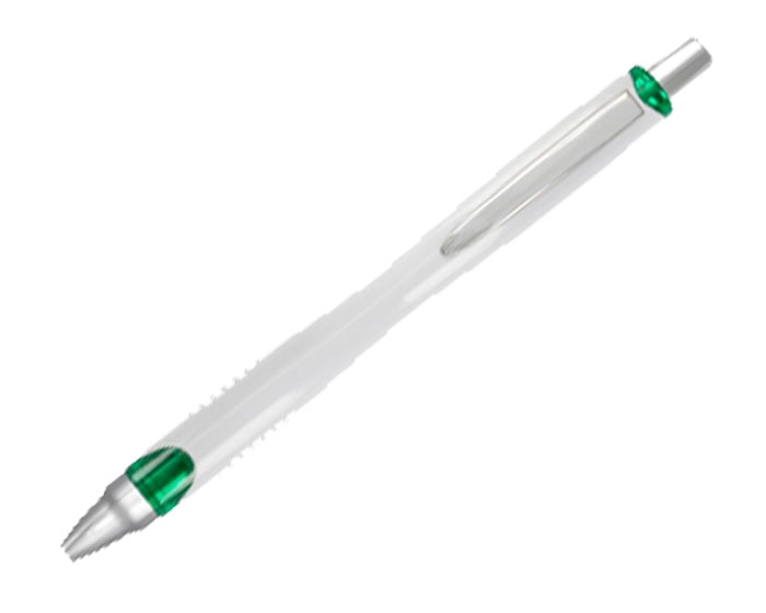 Bolígrafo de cuerpo blanco, forma ergonómica. Punta y clip cromado, detalle de color traslúcido en base. Artículo Promocional
