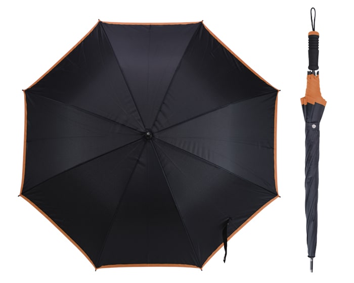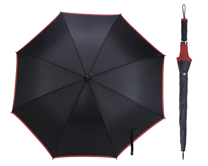 Paraguas de 8 gajos con botón de apertura automático, varillas y eje de fibra de vidrio. Cuenta con cintillo para guardar, orilla de color en los gajos, mango EVA con punta de color y cordón para transportar.