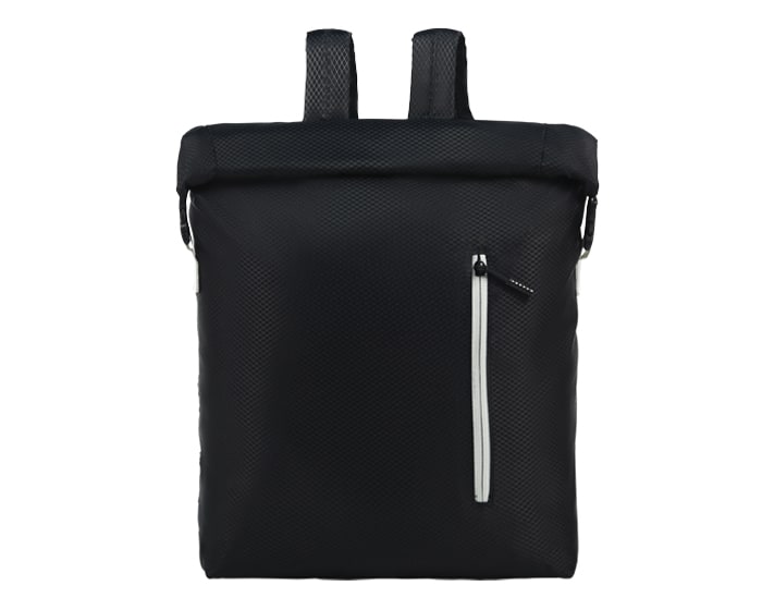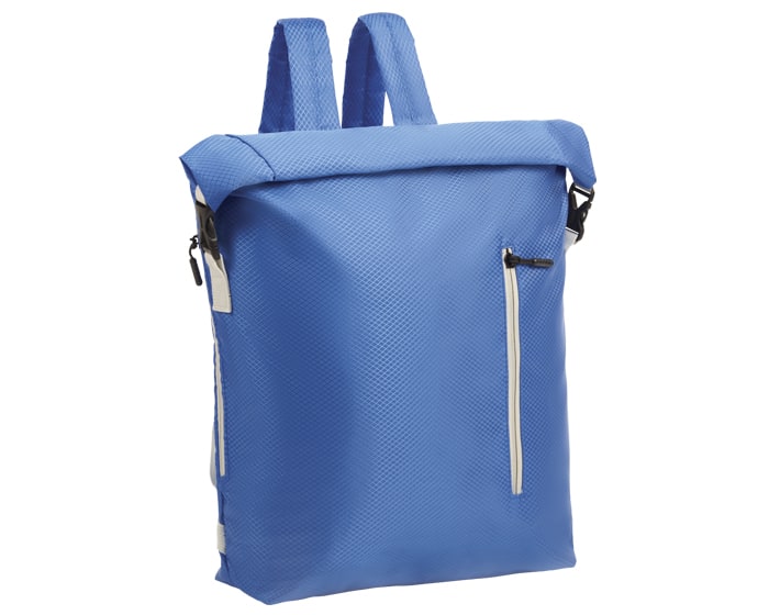 Mochila de poliéster deportiva repelente al agua, cuenta con una cubierta superior enrrollable con seguro de botón, 2 broches de seguridad, un compartimento frontal y uno lateral con cierre. Cuenta con tirantes acolchados de correas ajustables.