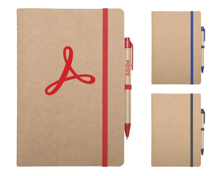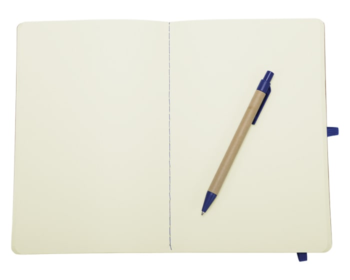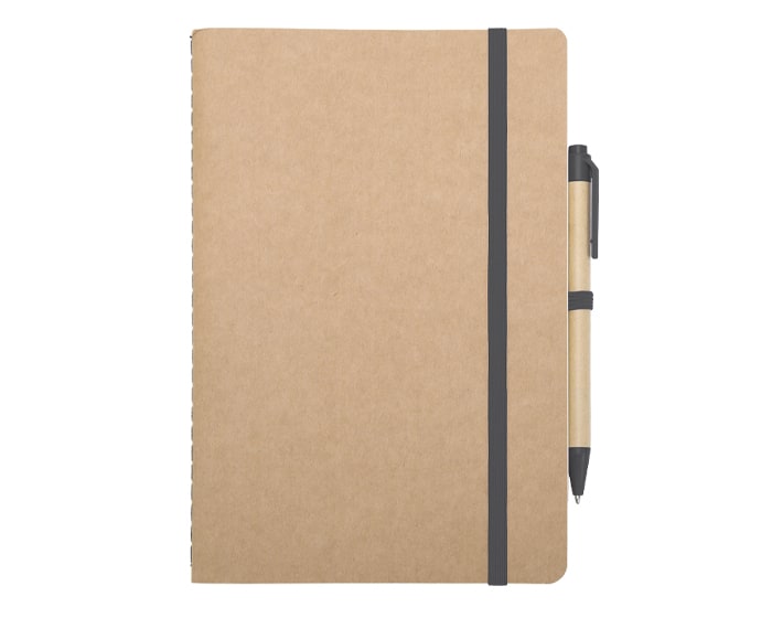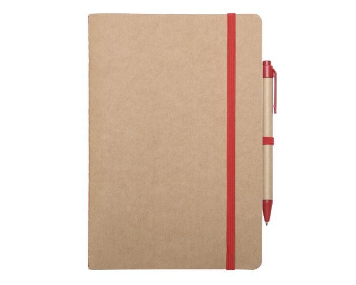 Libreta ecológica de hojas crema con cubiertas de cartón reciclado, incluye bolígrafo de cartón con mecanismo de click. Tiene resorte para sujetar el bolígrafo y otro para mantener cerrada la libreta.