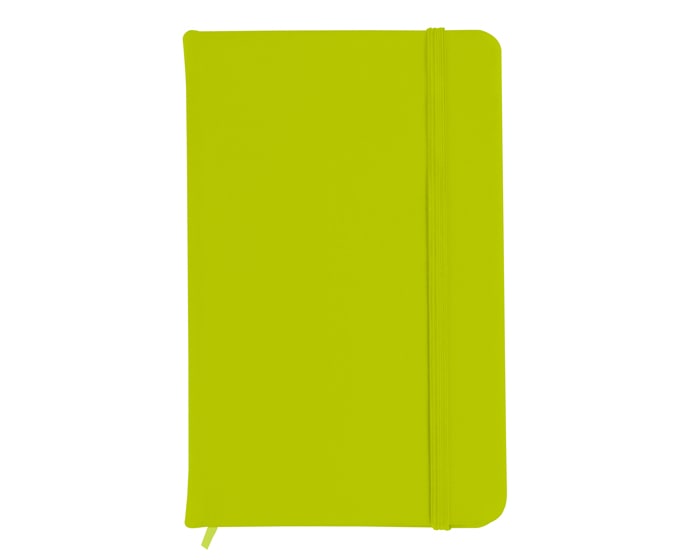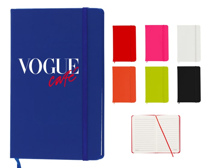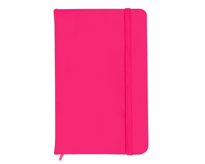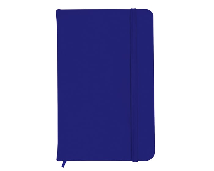 Libreta personal tamaño A6 para bitácora con 96 hojas rayadas (192 páginas), banda elástica para sujetar cubierta y separador de listón. Artículo Promocional