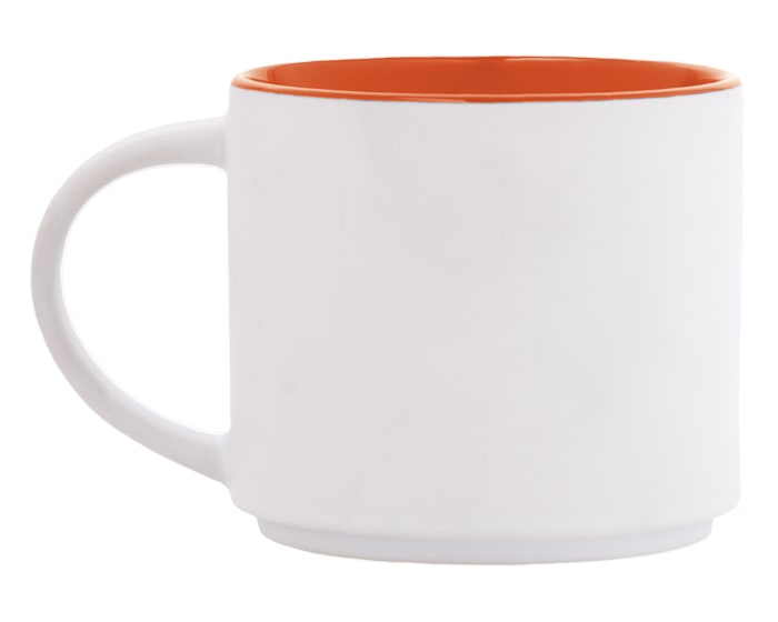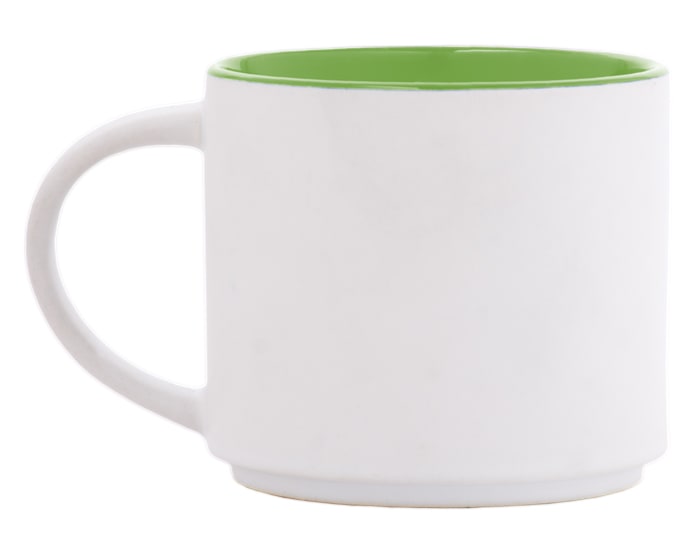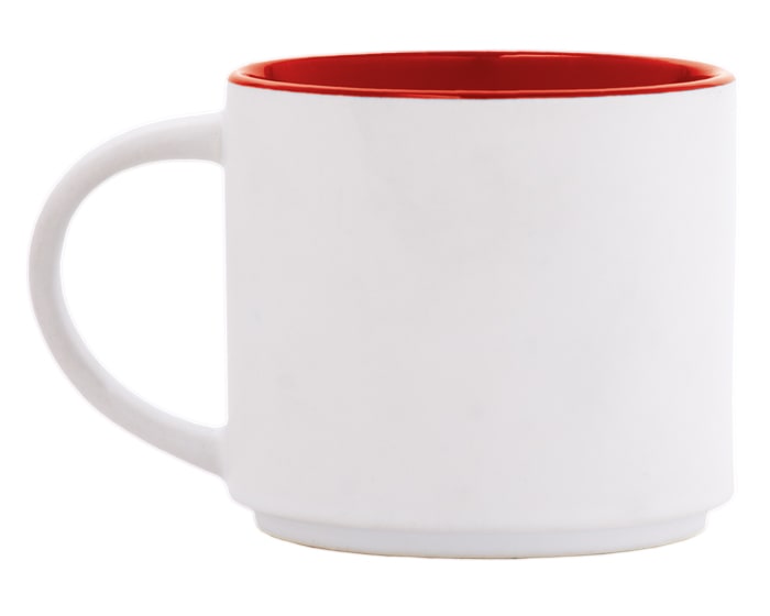 Taza de cerámica bicolor apilable, con exterior blanco mate e interior en color brillante. CAP. 15 OZ. Venta en múltiplos de 12. Artículo Promocional