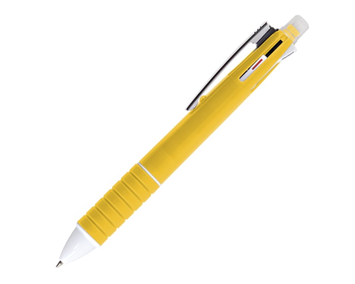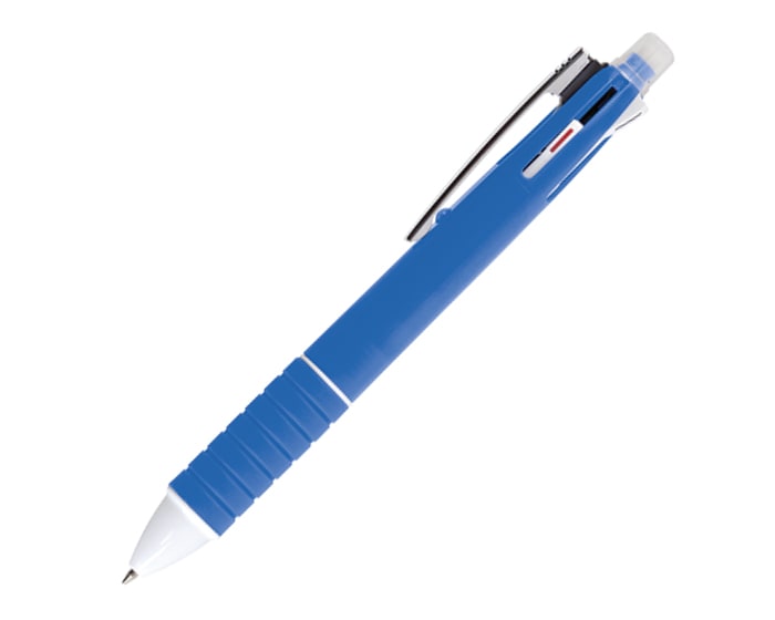 Bolígrafo 5 en 1: lapicero, tinta roja, azul, negra y verde; con goma en el extremo superior. Mecanismo deslizante para cambio de tinta.