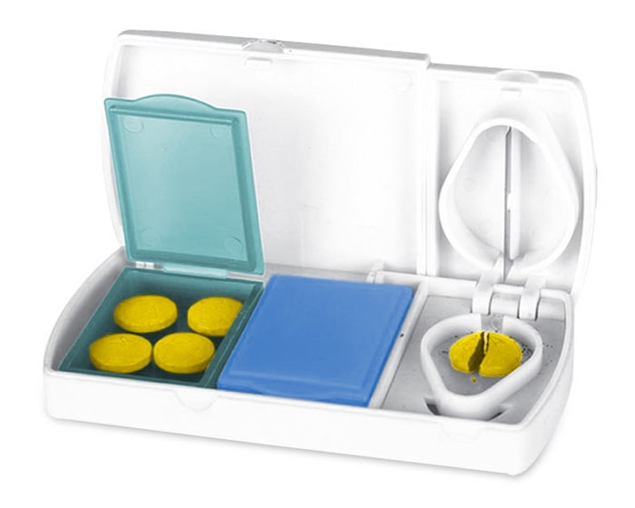 Pastillero cortapastillas. Incluye: dos estuches para separar medicamentos.