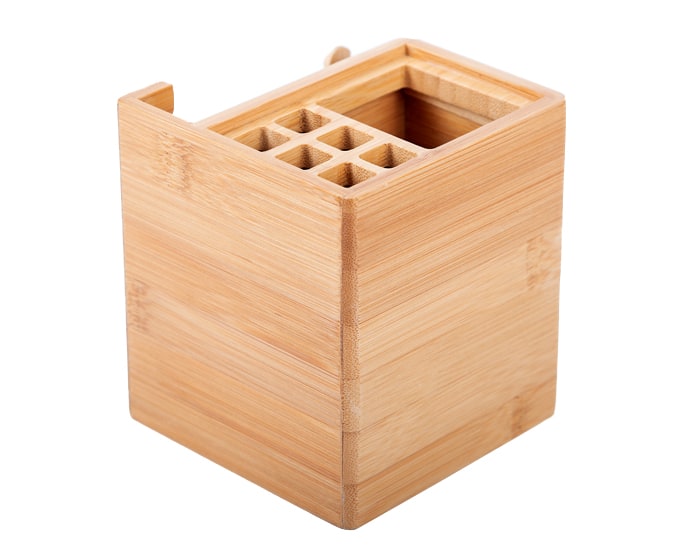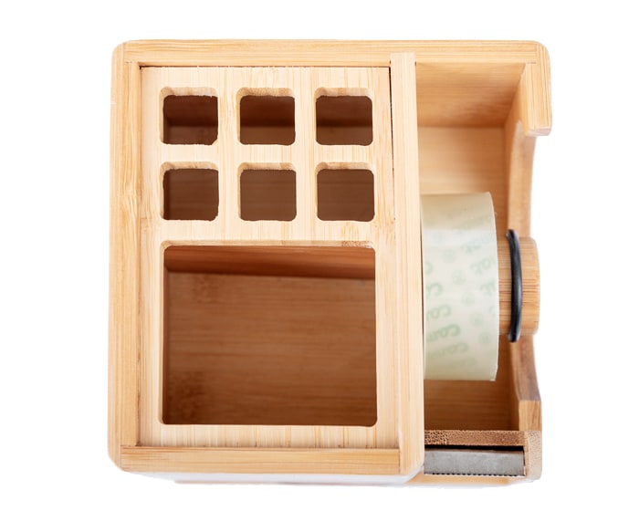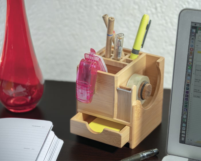 Lapicera multifuncional de bambú con diferentes ranuras para colocar lápices y bolígrafos. Incluye despachador de cinta adhesiva y cajón. Presentación: caja en color café.