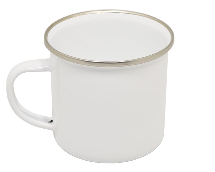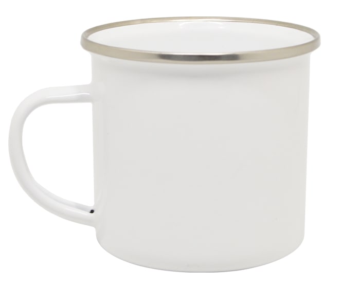Taza de peltre para sublimación. Borde con terminado plateado. Cap. 350 ml. (12 OZ). Artículo Promocional