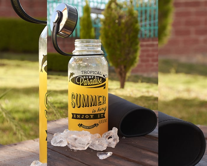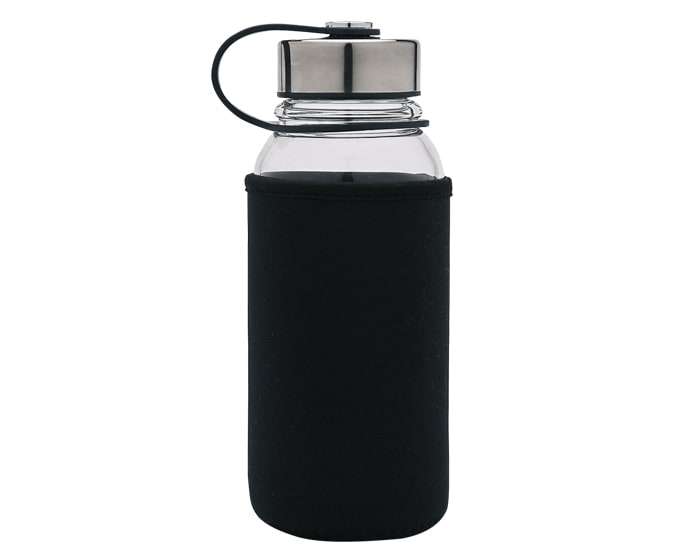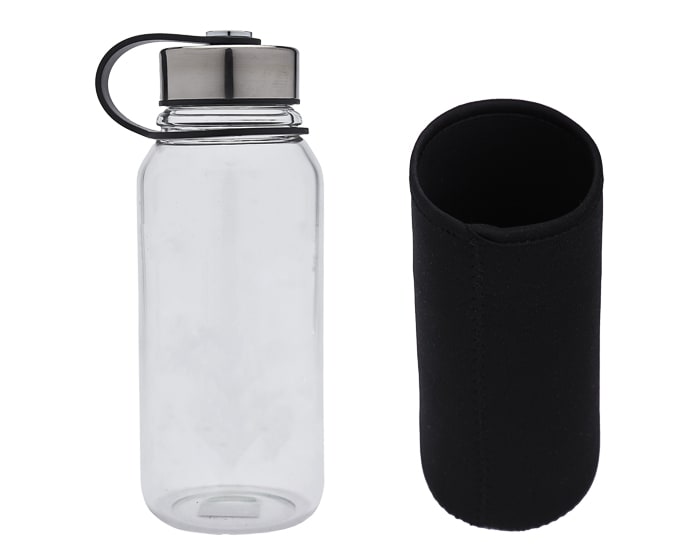 Cilindro de vidrio de borosilicato, de mayor resistencia ante el calor y los cambios de temperatura. Con tapa de rosca metálica, agarradera y funda protectora de neopreno. Para consumir bebidas de manera saludable, sin alterar el sabor o composición de los líquidos. CAP. 1000 ml. Presentación: caja en color negro.