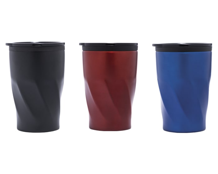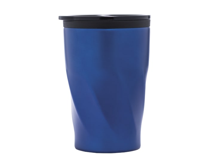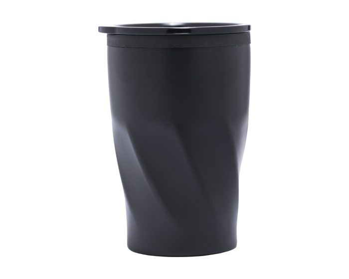 Termo de acero inoxidable acabado mate con interior de plástico. Cuenta con tapa de cierre a presión y seguro deslizable en color negro. Diseño poligonal. CAP. 350 ml.