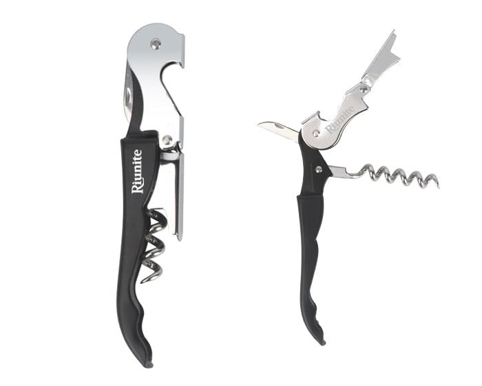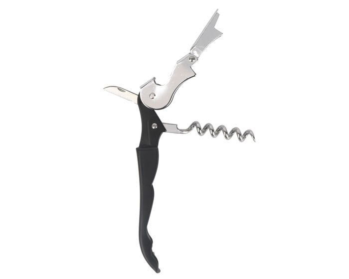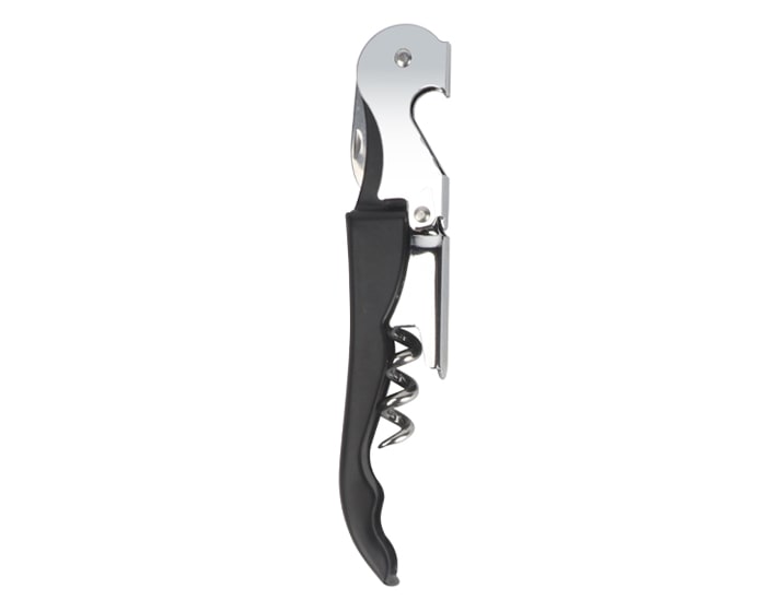 Sacacorchos con destapador y navaja de acero inoxidable. Presentación: Caja individual de kraft.