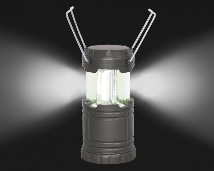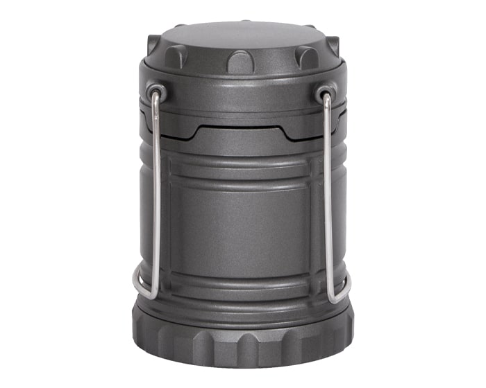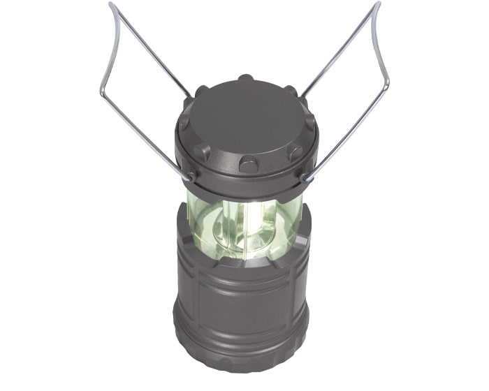 Lámpara LED de camping con sistema automático de encendido y apagado. Cuenta con doble asa abatible. Utiliza 3 Baterías AAA (incluidas) Presentación: caja en color blanco.