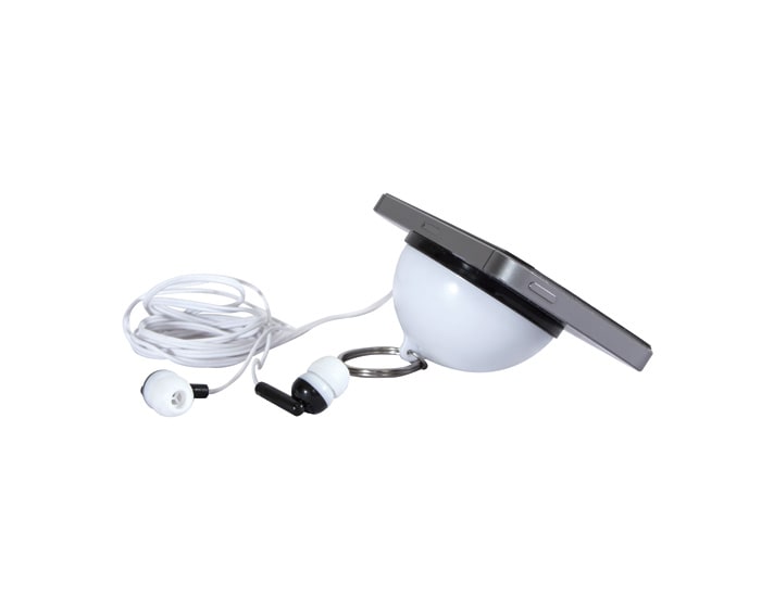 Audífonos personales y soporte para celular. Incluye estuche en forma de cápsula y argolla metálica para colgar. Extension total: 123 cm
