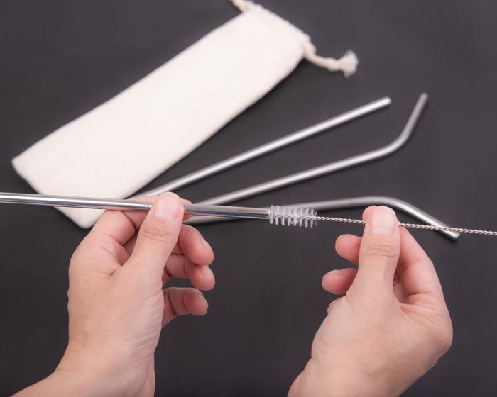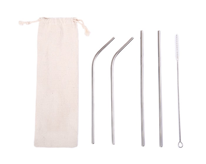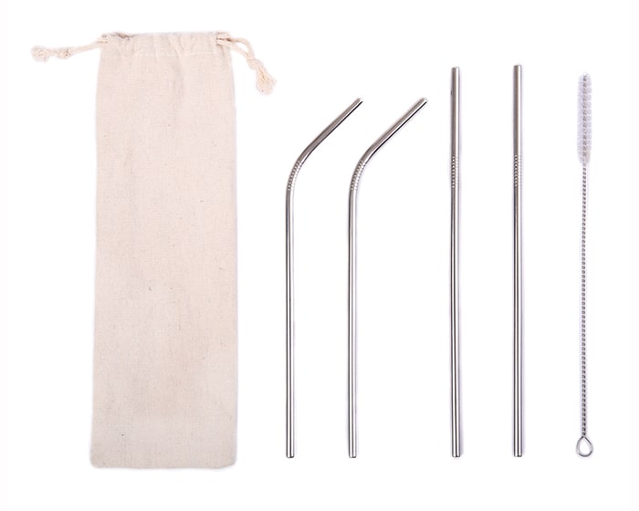 Kit ecológico de popotes de acero inoxidable. Cuenta con 2 popotes rectos, 2 curvos y 1 cepillo para limpieza de los popotes. Con estuche de algodón de jareta.