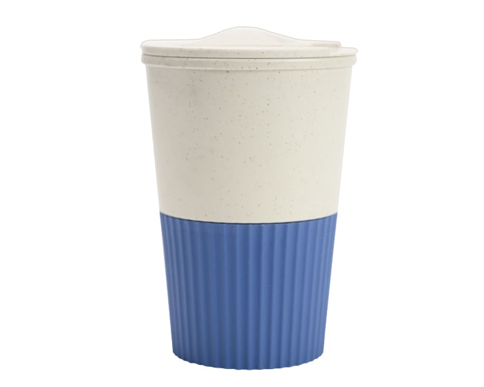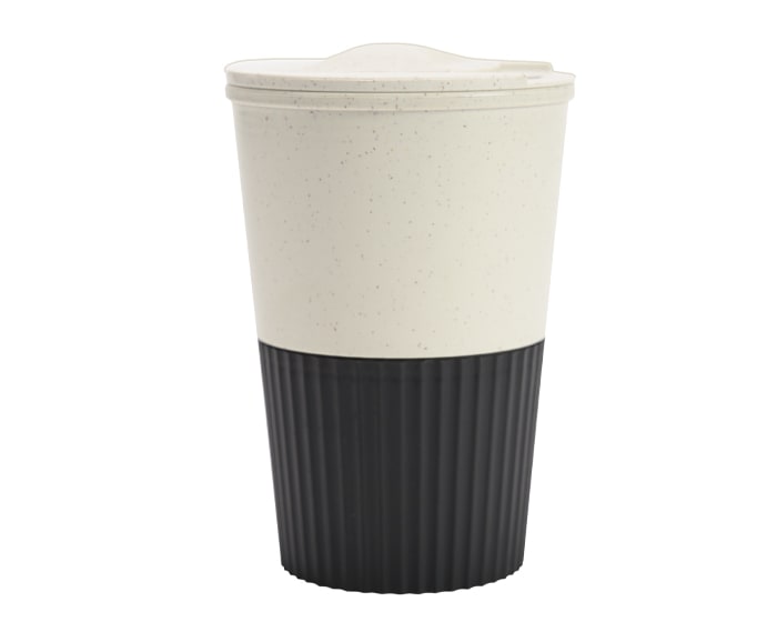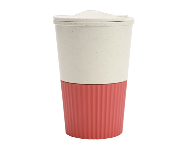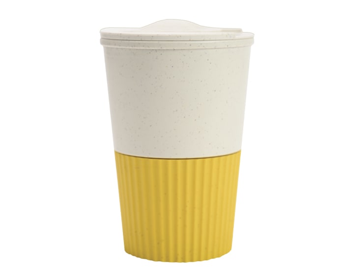 Vaso de fibra de trigo, con tapa de rosca y seguro deslizable, cuenta con diseño de manga de color texturizada. CAP. 380 ml.