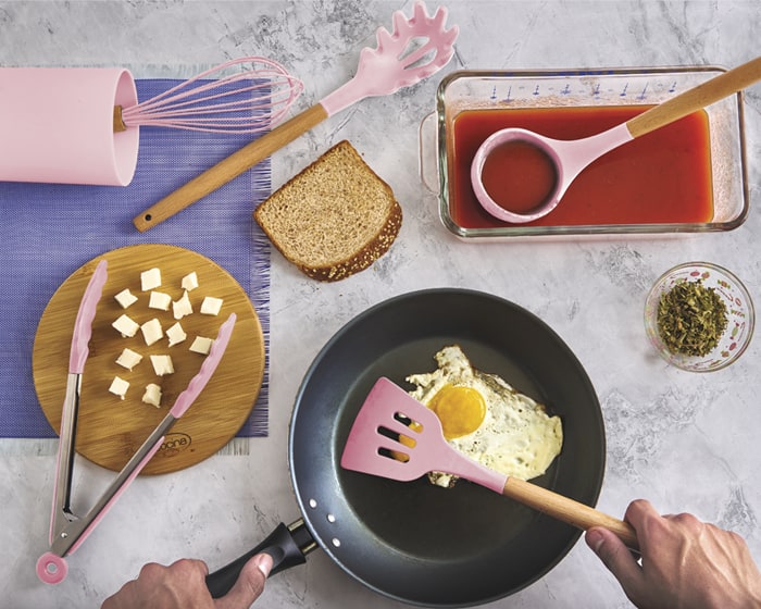 Kit de cocina con utensilios de silicón y mango de madera que contiene: 1 batidor de acero inoxidable, 1 volteador, pinzas de cocina, 1 cucharon y 1 cuchara para pastas. Incluye base de plástico para guardar. Presentación: caja en color blanco.