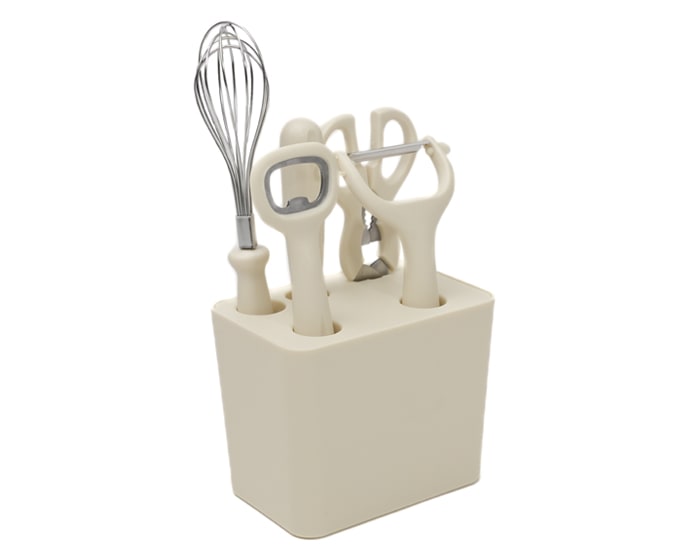 Kit de accesorios de cocina que contiene: tijeras, batidor, pelador, destapador y cuchillo. Cuenta con una base de soporte. Presentación: caja en color blanco.