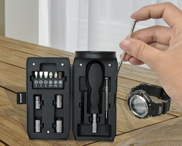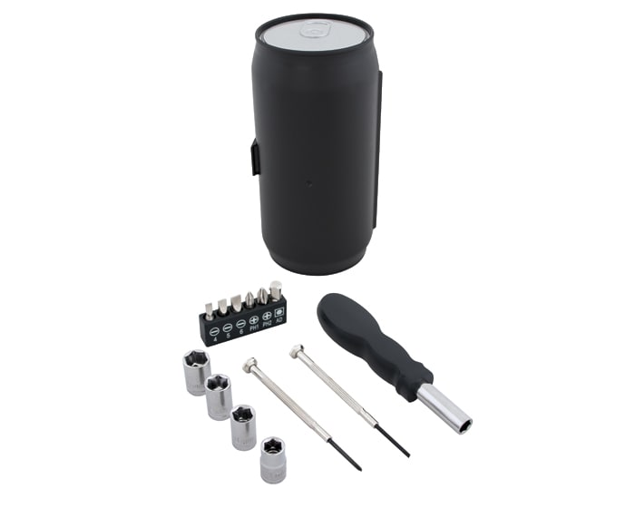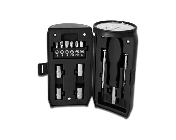 Juego de herramientas en forma de lata. Incluye: desarmador, extensión, 5 puntas de desarmador, 4 dados y 2 desarmadores de relojero. Presentación: caja en color negro.