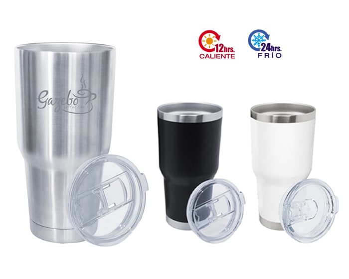 Termo para auto con doble pared de acero inoxidable insulado al alto vacío con capa interior de cobre. Conserva el frío por 24 hrs. y el calor por 12 hrs. Incluye tapa transparente de cierre a presión con seguro deslizable. CAP. 870 ml. Presentación: caja en color blanco.