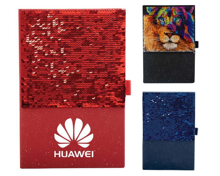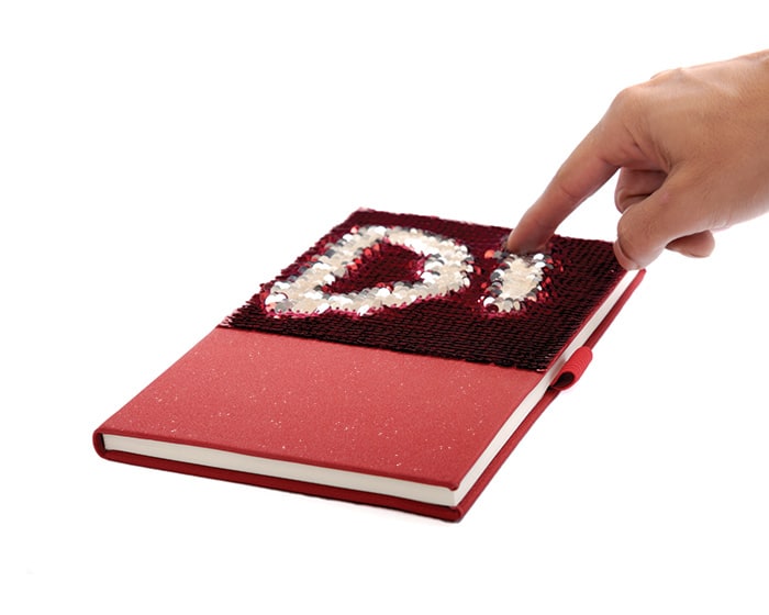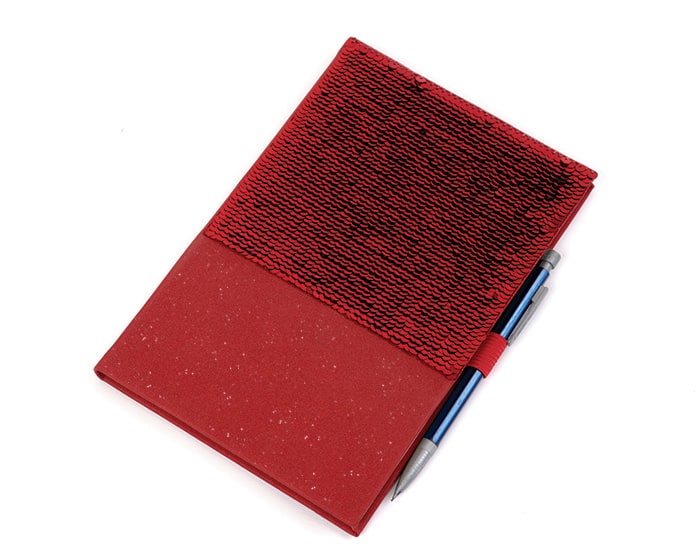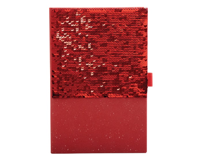 Libreta vertical A5 de pasta rígida con textura brillante y detalle de lentejuela reversible. Con 80 hojas rayadas (160 paginas). Separador de listón y porta bolígrafo elástico.