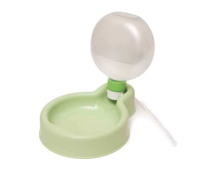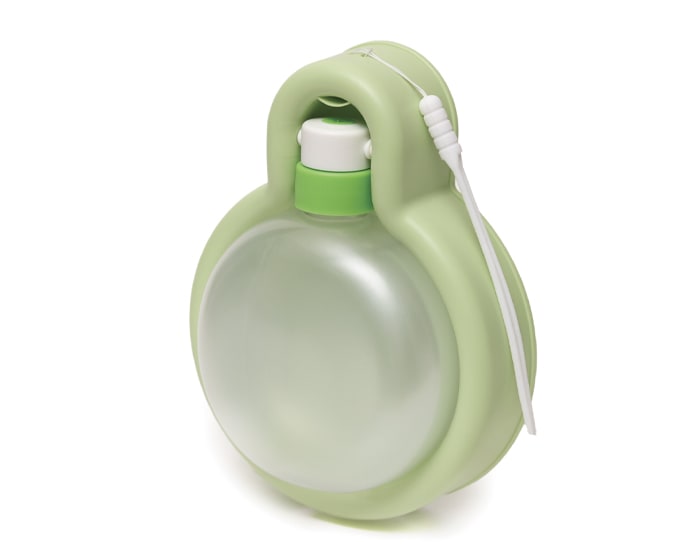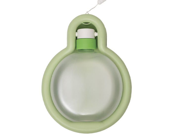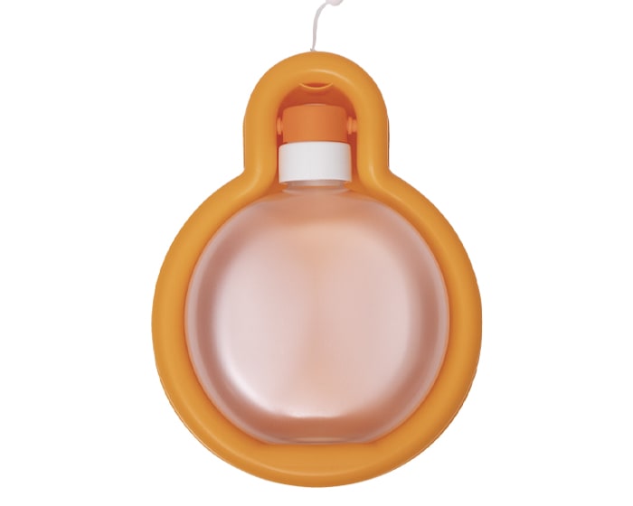 Bebedero plegable para mascotas en forma de globo con boquilla de rosca y base plegable que funciona como bebedero. Incluye asa de silicón para transportar. Cap. 500 ml.