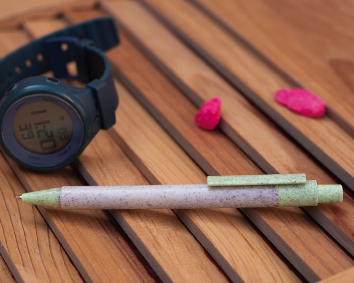Bolígrafo ecológico a base de fibra de trigo, clip y punta de color. Mecanismo de click. Artículo Promocional
