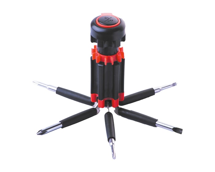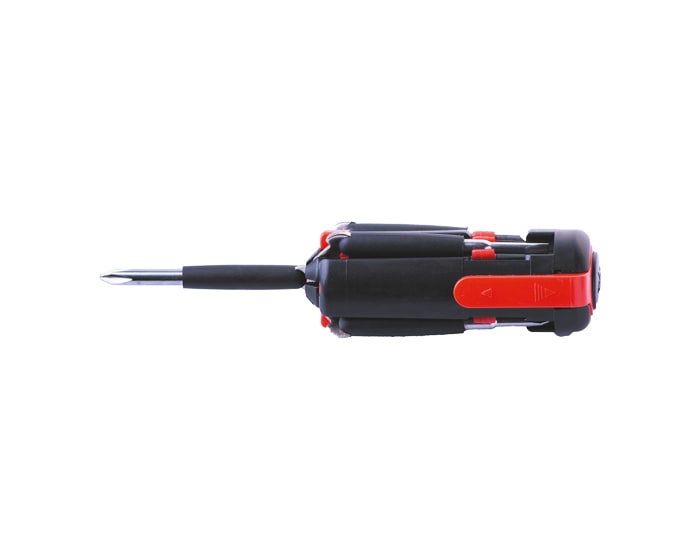 Desarmador con lámpara todo en uno, cuerpo de plástico, con botón encendido/apagado, 5 puntas diferentes y 4 LEDS. Cuenta con mecanismo de bloqueo para seguro de los desarmadores. Fácil de usar y transportar. Utiliza 2 baterías AAA (no incluidas). Presentación: caja en color blanco.
