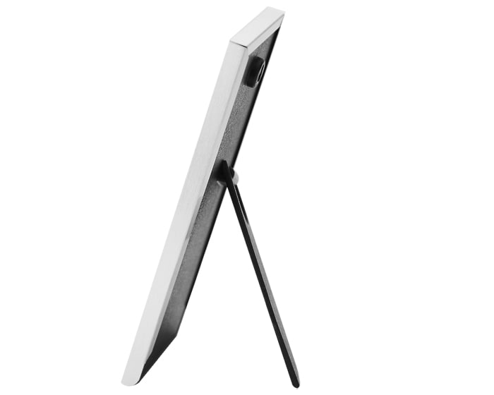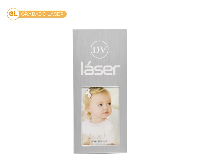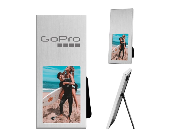 Portarretratos de aluminio con soporte plegable. Se puede acomodar de forma horizontal o vertical. Presentación: caja en color blanco.