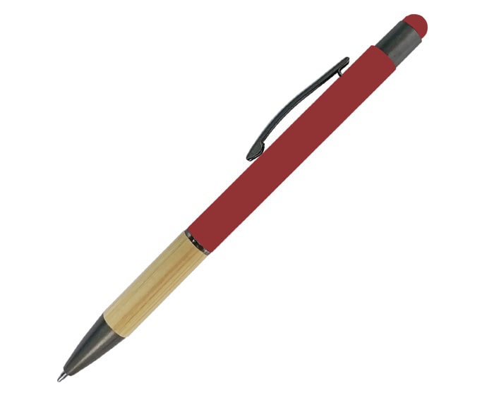 Bolígrafo de aluminio con touch screen, grip de bambú, clip de metal, cuerpo con terminado tipo rubber. Mecanismo de click. Artículo Promocional