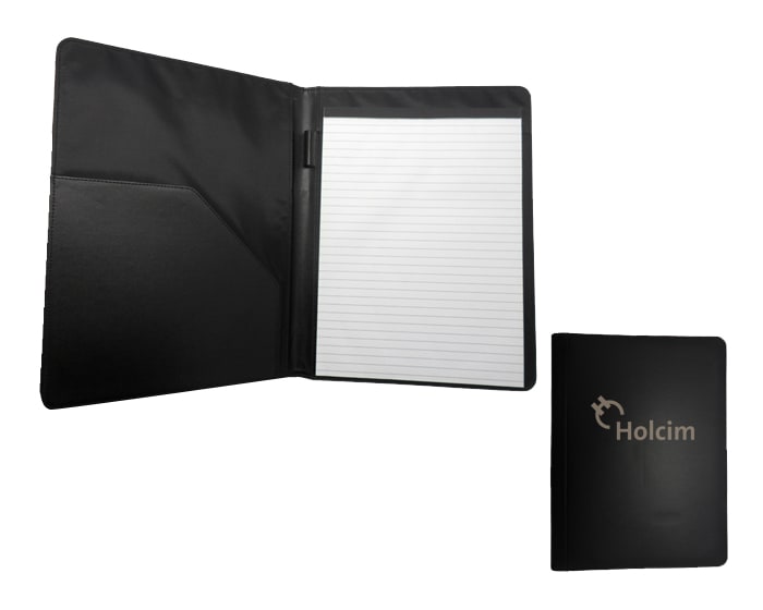 Carpeta de curpiel tamaño carta con block de 20 hojas rayadas, compartimento lateral para papeles y documentos. Artículo Promocional