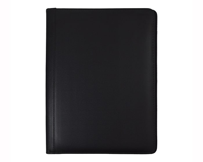 Carpeta de curpiel tamaño carta con block de 20 hojas rayadas, compartimento lateral para papeles y documentos.