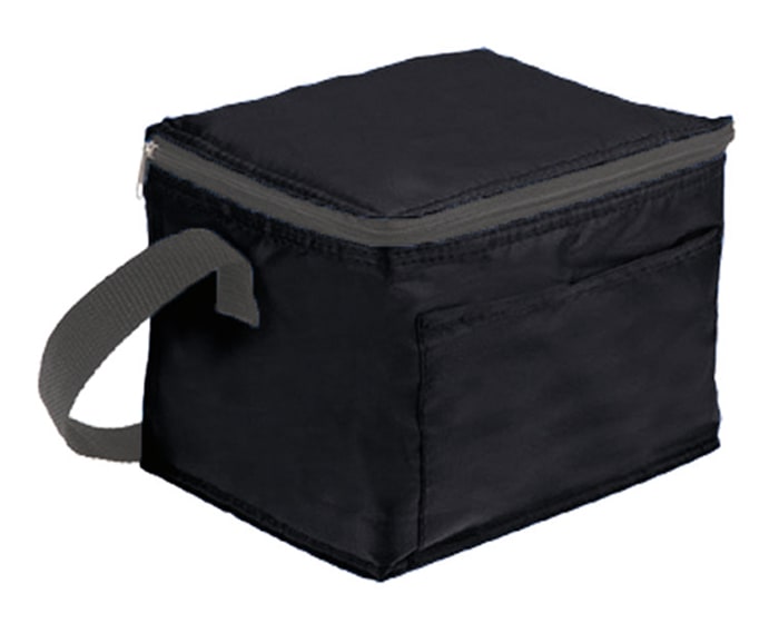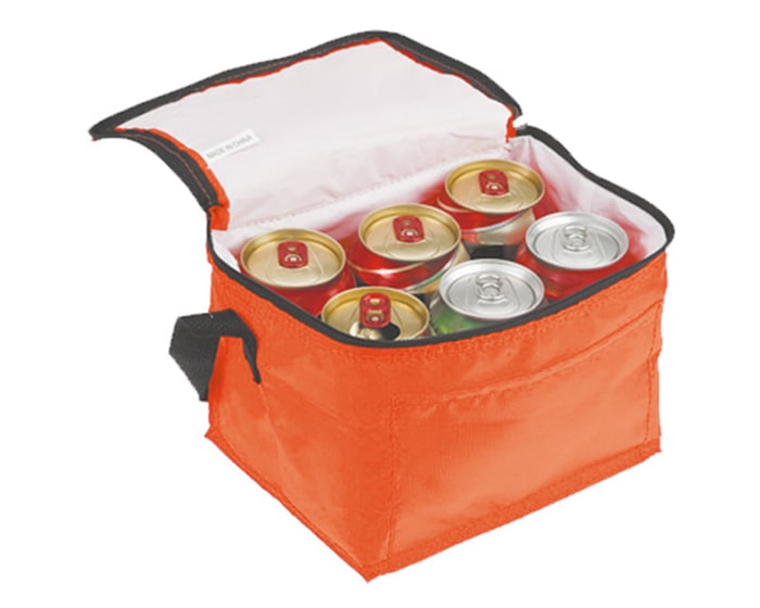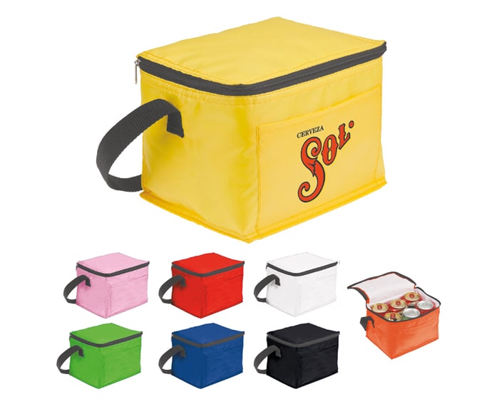 Lonchera / Hielera con cubierta cosida e interior termosellado en plástico anti escurrimiento con compartimento frontal y correa ajustable. CAP. 6 latas.
