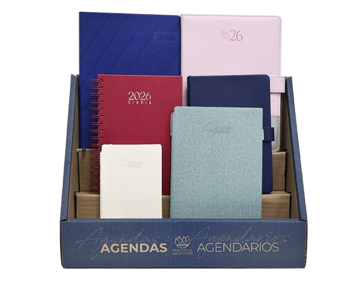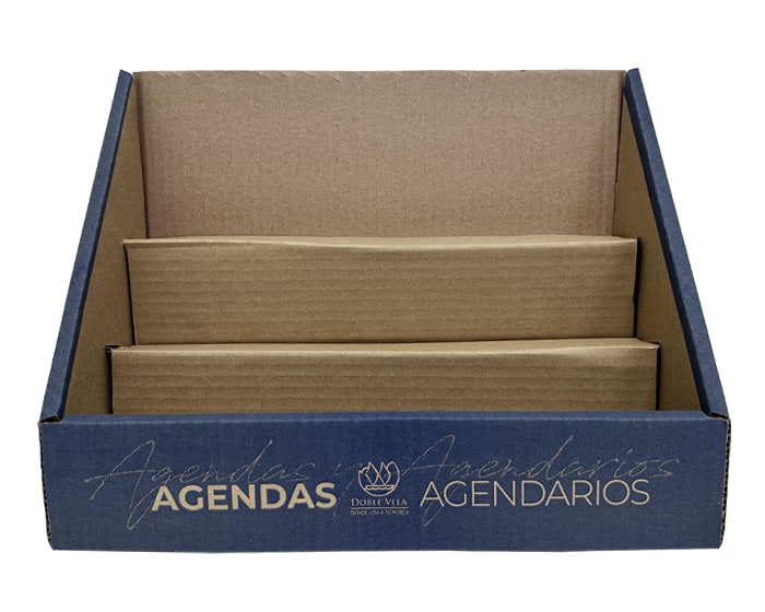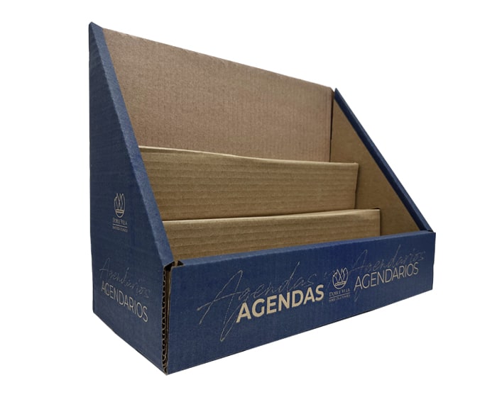 Exhibidor de cartón para agendas y agendarios; cuenta con 4 niveles que permiten colocar 2 agendas por nivel, diseño resistente y fácil de armar, ideal para mostradores y puntos de venta.
