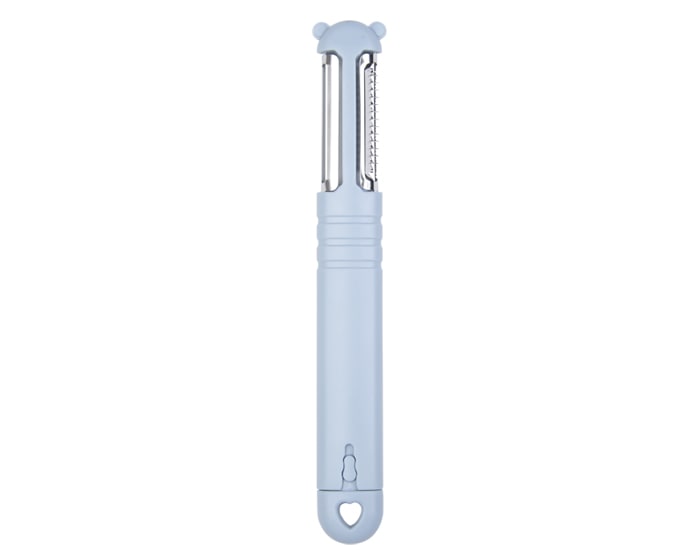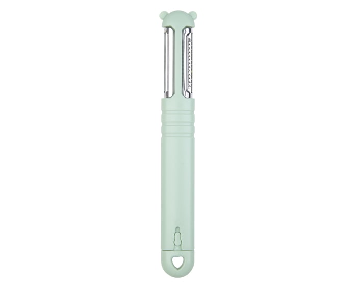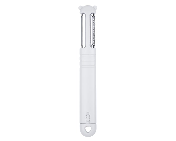 Utensilio de cocina con pelador y rallador de alimentos que cuenta con un cuchillo portátil fácil de usar. Presentación: caja en color blanco.