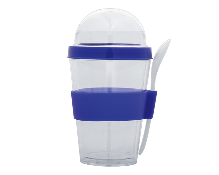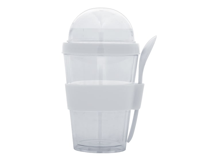 Vaso de doble pared de plástico con cuchara. CAP. 300 ml. Presentación: caja en color blanco. *BPA FREE.