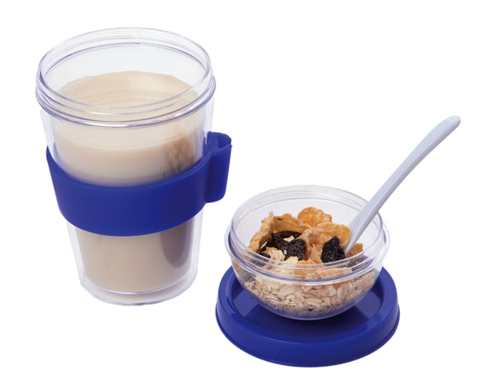 Vaso de doble pared de plástico con cuchara. CAP. 300 ml. Presentación: caja en color blanco. *BPA FREE. Artículo Promocional