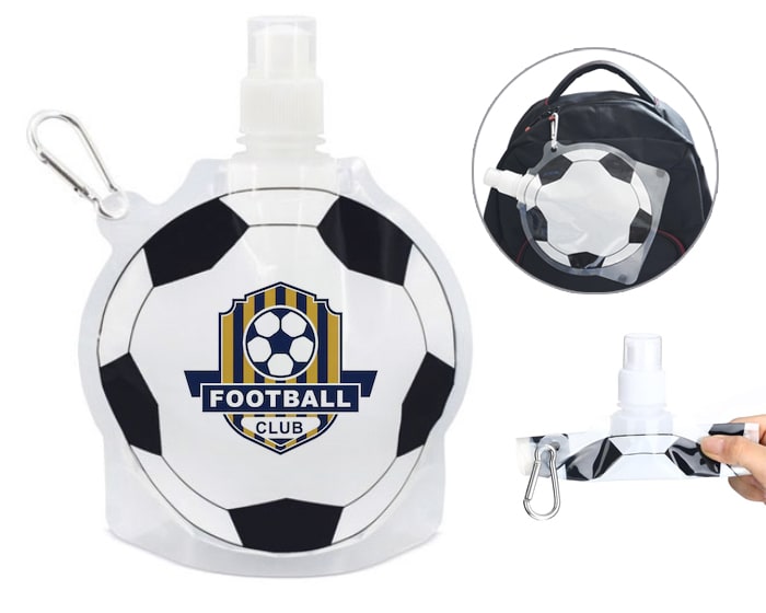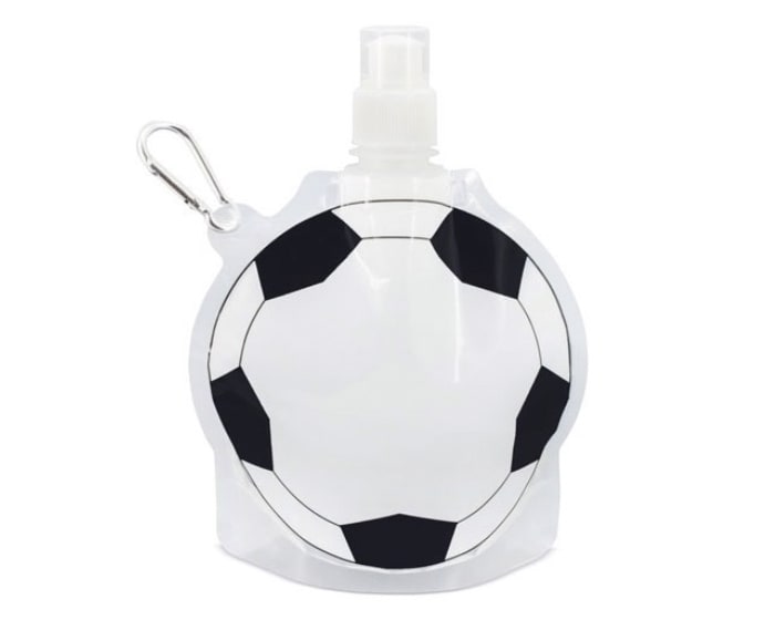 Bolsa para bebidas con diseño de balón de fútbol, con tapa de rosca y válvula con tapón, incluye arnés metálico para colgar. CAP. 800 ml.