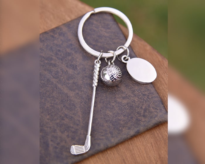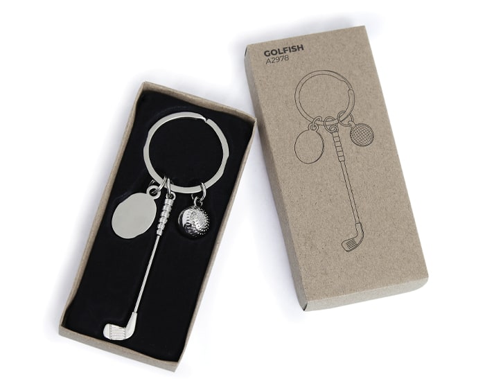Llavero en forma de juego de golf, con placa de aleación de zinc y arillo reforzado de hierro. Presentación: Caja individual de kraft. Artículo Promocional