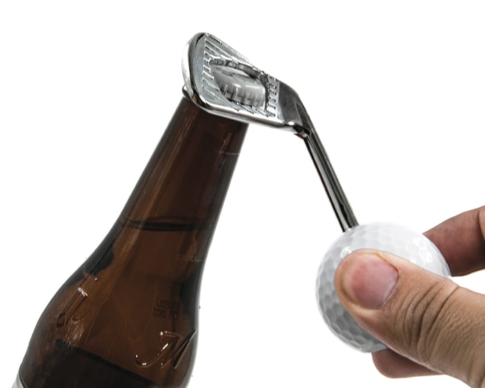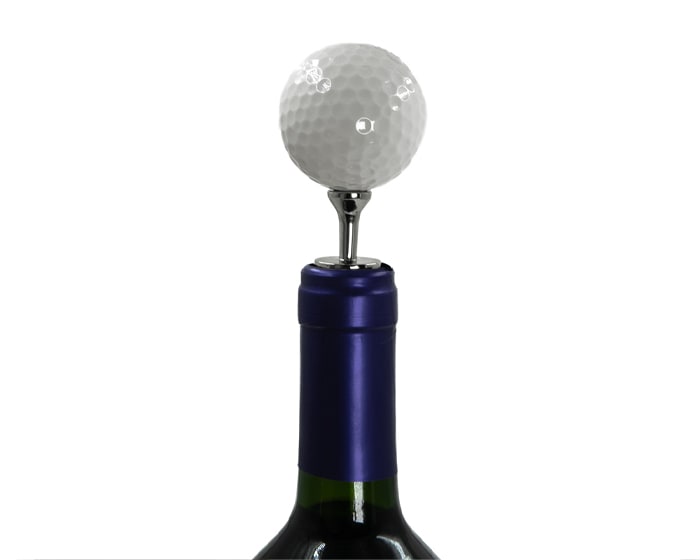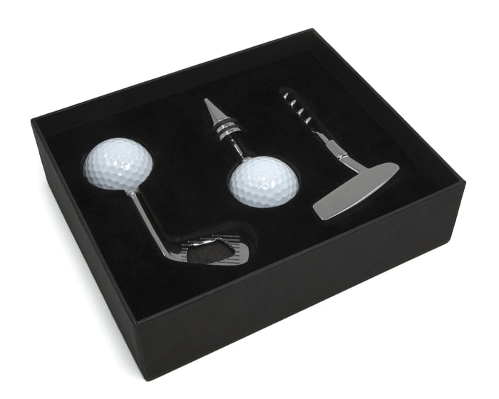 Set de herramientas para vino en forma de accesorios de golf, contiene: 1 destapador, 1 tapón para botellas y 1 sacacorchos. Presentación: caja en color negro.