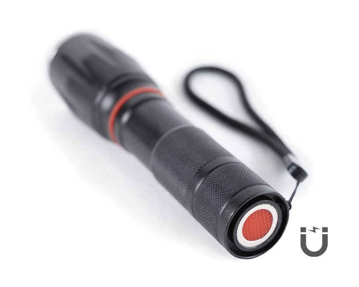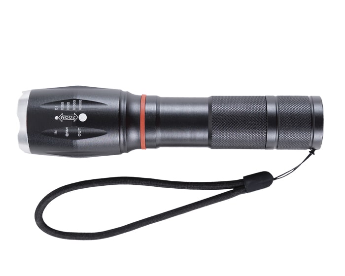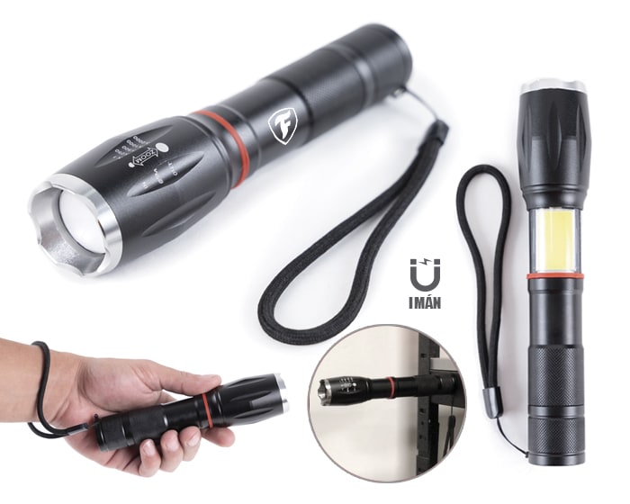 Linterna de emergencia portátil plegable resistente a la lluvia que incluye: botón de encendido y apagado, 5 modalidades de luz de (5W) con lente zoom para fijar la distancia deseada, 1 lámpara LED lateral de (3W) e imán en la parte trasera del mango para adecuarse a cualquier superficie metálica. Incluye correa para transportar. Utiliza 3 baterías AAA (incluidas). Presentación: Caja de regalo a color.