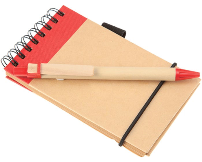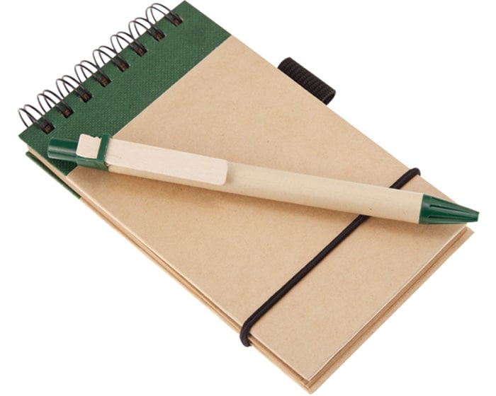 Libreta de papel reciclado con 50 hojas rayadas (100 páginas), espiral metálico color negro y cinta elástica. Incluye bolígrafo de papel con clip de madera.