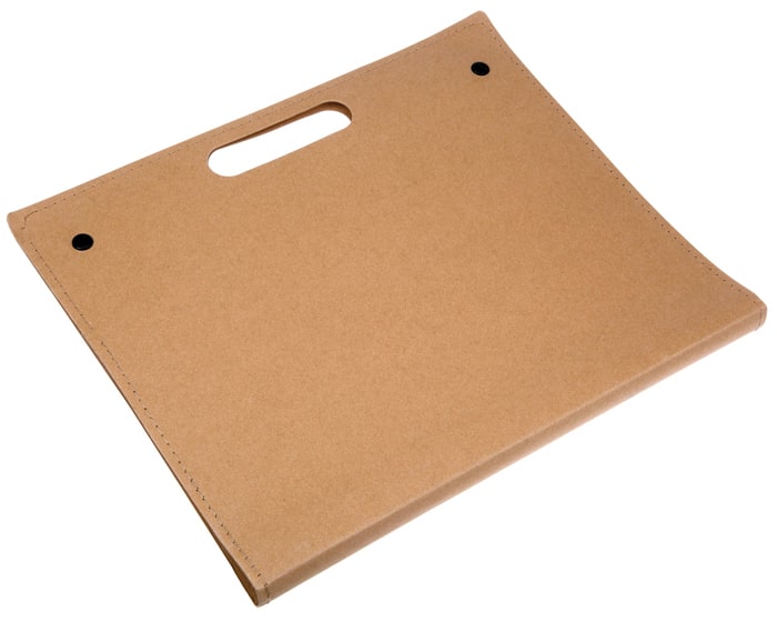 Portafolios de cartón con broches de presión, block de 20 hojas rayadas, notas adhesivas y pluma ecológica.