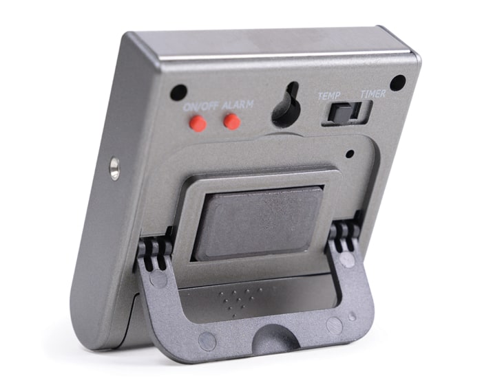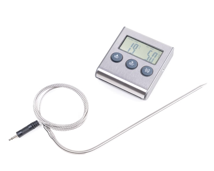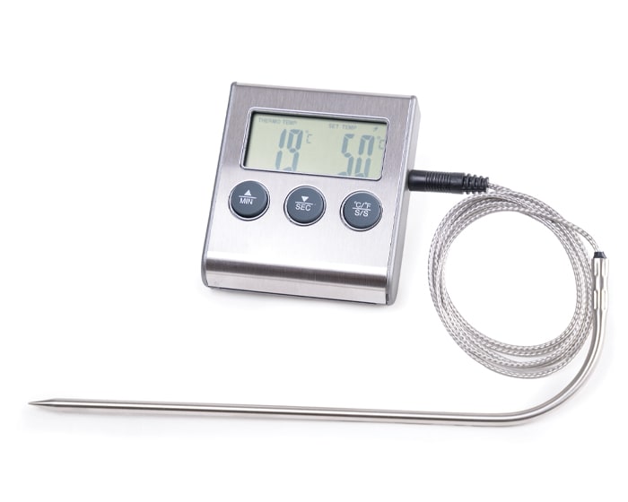 Termómetro de cocina con pantalla digital con funciones de: medición de temperatura para alimentos, temporizador y botón de alarma. Los botones frontales marcan los minutos, segundos y temperatura en grados Centígrados o Fahrenheit, de acuerdo a la función que se elija. Timer de hasta 99 minutos; Rango de resistencia: de -50 a 300 grados centígrados. Incluye: aguja térmica de acero inoxidable con extensión de metal galvanizado para la medición de temperatura de carnes, en hornos o parrillas. La parte trasera cuenta con base plegable para sostenerse en la mesa, orificio e imán para colgarse en pared o en superficies metálicas. Utiliza una pila AAA incluida. Presentación: caja de color.