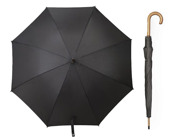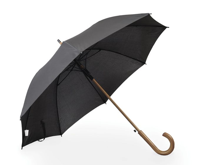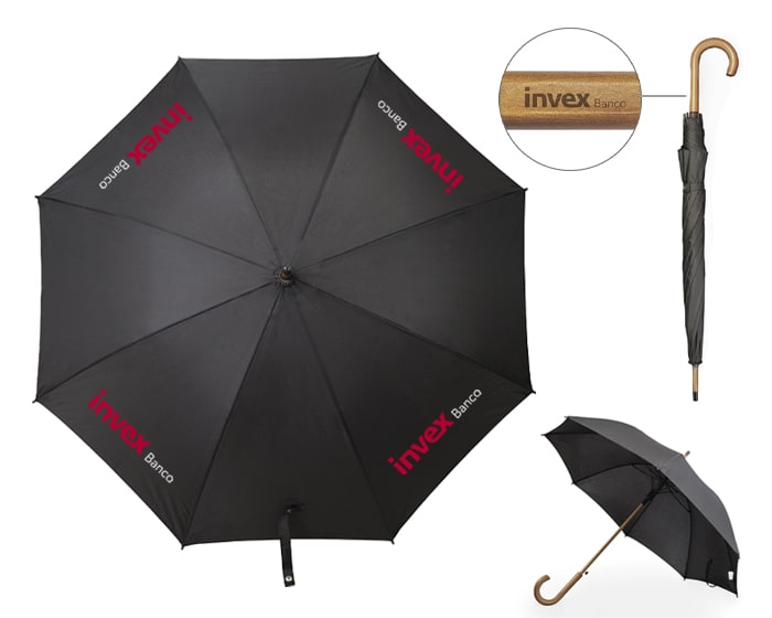 Paraguas de 8 gajos con botón de apertura automática, varillas de fibra de vidrio, bastón y mango curvo de madera. Artículo Promocional