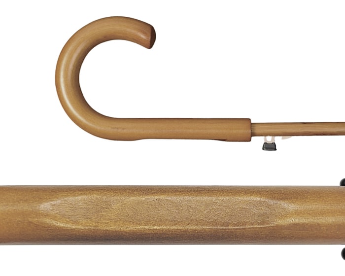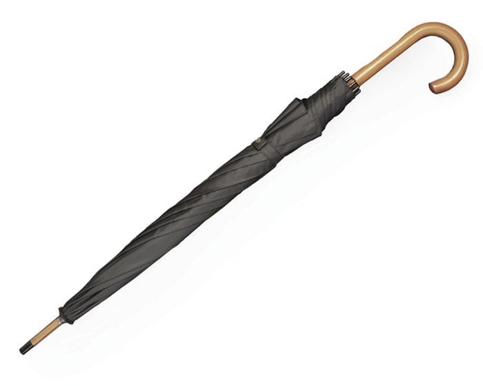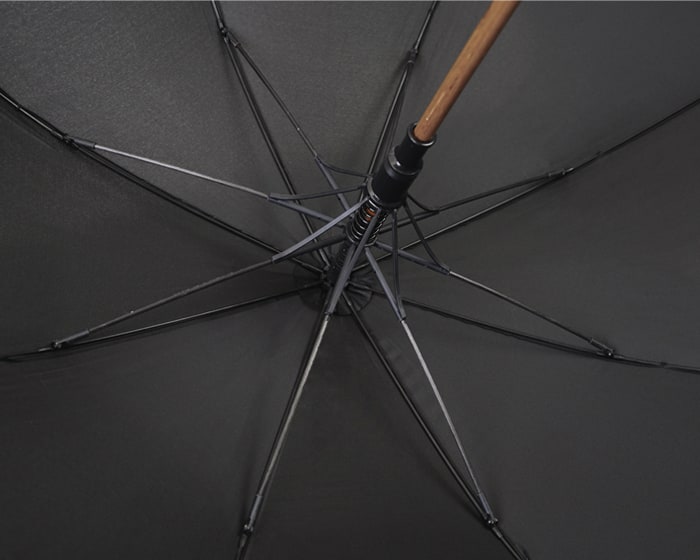 Paraguas de 8 gajos con botón de apertura automática, varillas de fibra de vidrio, bastón y mango curvo de madera.